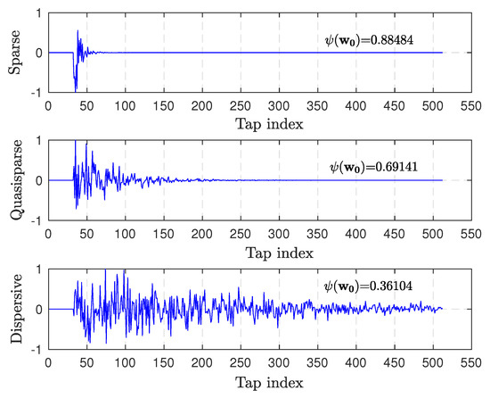 The proposed algorithm is evaluated in different system identification scenarios. Considering the application of the SI channel with variable sparsity, three different SI channels with 512 coefficients are used in the following simulation experiments. The impulse response of three SI channels is shown in Figure 4. For all algorithms, the initial weight vector , the initial step-size , and the relevant parameters of the NSAF class algorithms are set to , . Therefore, we can get that each iteration of the proposed algorithm requires 5201 multiplications and 5760 additions according to Table 1. The two-order autoregressive (AR(2)) signal is used as an input signal to validate the proposed algorithm. Furthermore, SI is the communication signal leaked from the transmitter in ISUDC, so the BPSK modulated signal as the common communication signal is also used as another input signal to validate the feasibility of SI cancellation in ISUDC. For the BPSK modulated signal, the frequency bandwidth is 4–8 kHz, the sampling frequency is = 48 kHz, and the carrier frequency is = 6 kHz. The performance of the algorithms is compared with the same number of iterations. In the simulation experiment, when the input signal is the AR(2) signal, the number of iterations is set to 119,500, and the number of iterations is set to 180,000 when the input signal is the BPSK signal. The purpose of SI cancellation is to improve the performance of target parameter estimation, and the direction of arrival (DOA) is an important estimation parameter of ISUDC, so we compare the DOA estimation performance for the output signal after the SI cancellation. We consider two kinds of noise models in the following simulation experiments, the white Gaussian noise and the -stable distribution impulsive noise.