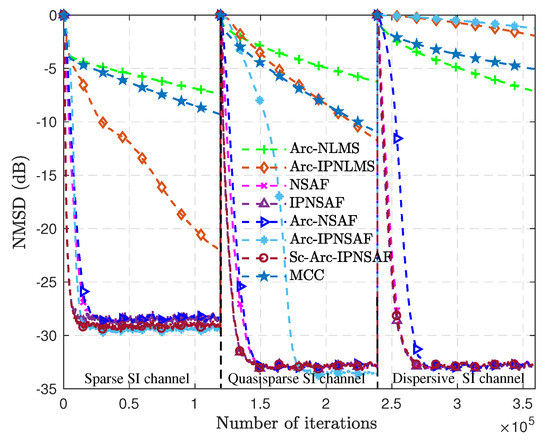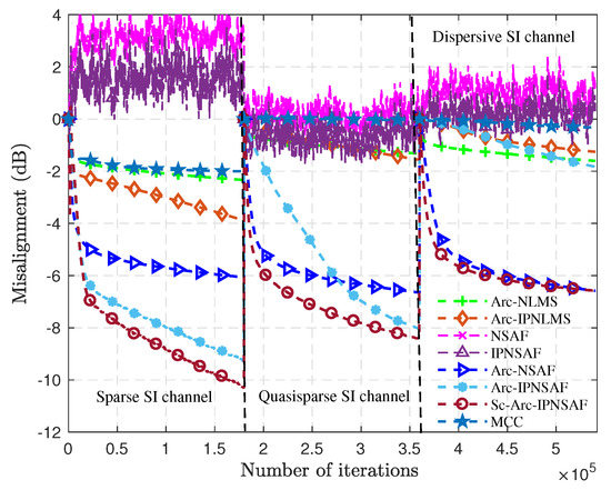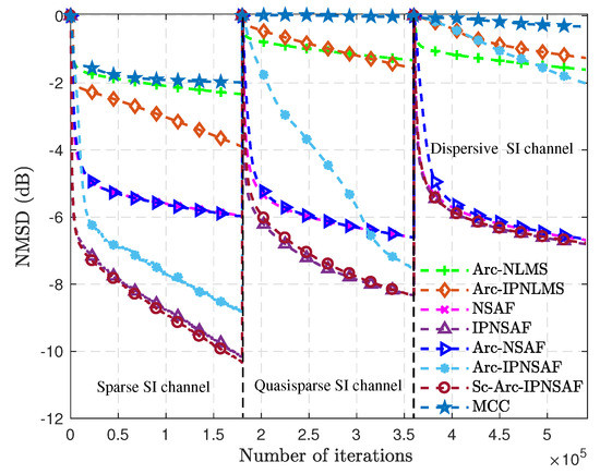 Table 1 shows that the Sc-Arc-IPNSAF algorithm has the highest computational complexity, and the MCC algorithm is the lowest because the sparsity of the SI channel is estimated. The coefficient of the cost function is adaptively adjusted to satisfy the SI channel with different sparsity. The Sc-Arc-IPNSAF algorithm only increases the 2M + 10N multiplication and 3M−3N addition compared with the IPNSAF algorithm. As a comparison, the additional computational complexity of Sc-Arc-IPNSAF is still in the same order of magnitude as other referenced algorithms, and it can be acceptable and easy to implement in engineering hardware.