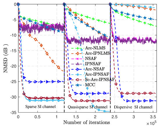 As can be seen from Figure 7 and Figure 8, the Sc-Arc-IPNSAF algorithm has a faster convergence speed for different SI channels, and its NMSD is smaller when the BPSK signal is input. Still, the NSAF and the IPNSAF algorithms are ineffective and cannot eliminate SI normally. In addition, the Sc-Arc-IPNSAF algorithm has stable performance for different SI channels and is better than the MCC, Arc-NLMS, Arc-IPNLMS, NSAF, and IPNSAF algorithms when the AR(2) signal is input. Unfortunately, it is unacceptable that the convergence speed of the Arc-IPNSAF algorithm drops sharply under the dispersive SI channel. Therefore, the Sc-Arc-IPNSAF algorithm improves the robustness for different sparsity SI channels with sparsity control.