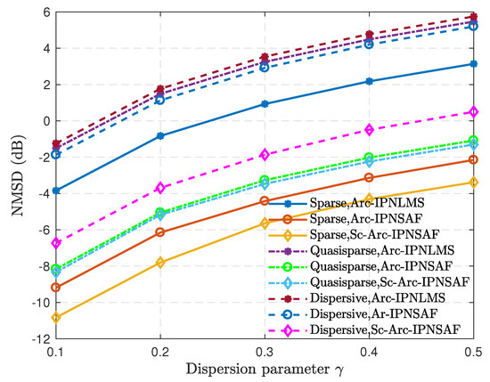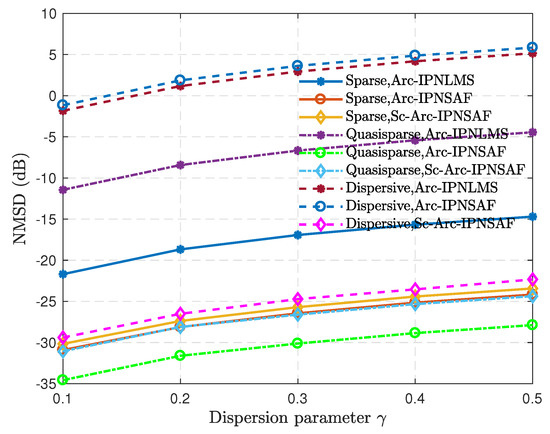 From the simulation results, the performance of these algorithms deteriorates with the increase of , and these algorithms without sparsity control fail as increases to some degree. Moreover, the Sc-Arc-IPNSAF algorithm has a low steady-state NMSD for different SI channels when the BPSK signal is the input signal. The Arc-type algorithms without sparsity control have a significant difference in performance under the different sparsity SI channels. The Sc-Arc-IPNSAF algorithm has stable performance for different SI channels, and the Arc-IPNSAF has similar performance in the sparse and quasisparse SI channels. Besides, the Sc-Arc-IPNSAF algorithm also has the best performance when the SI channel is dispersive, but the Arc-IPNSAF algorithm has the worst performance.