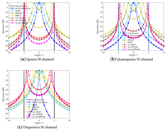 Figure 11 shows the spatial spectra of the received signal processed by different SI cancellation algorithms under three different SI channels. We know that the target cannot be estimated correctly without SI cancellation processing because the SI masks the target. While the two targets can be estimated after some adaptive filtering processing, the DOA estimation value of the received signal processed by the proposed algorithm is closest to the real value, which indicates that the estimation accuracy is the highest. The proposed algorithm has the optimal performance for different SI channels. Therefore, the Sc-Arc-IPNSAF algorithm has a good effect on the SI cancellation of ISUDC.
