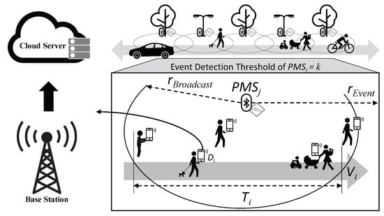 In urban systems for a smart city using Wireless Sensor Network (WSN) technologies, real-time environment monitoring is essential to provide helpful information that can be used for urban management [1]. To acquire data from multiple sensors deployed on urban monitoring systems, sensing technologies such as Bluetooth and radio-frequency identification are essential [2]. In addition, WSN-based sensing communication has been developed rapidly and applied in many areas [3]. Users with mobile devices (e.g., smart phones, smart watches, and smart tablets) are connected to a WSN, and many static sensors are sparsely deployed in the urban systems [4]. Mobile devices are used to relay the data from sensors to a cloud server and should satisfy event reliability such that the quantity of sensing data is large enough to be utilized [5]. Furthermore, reliable data acquisition at numerous urban monitoring places from the macroscale to the microscale has been required. In urban monitoring systems with a WSN, a large number of scattered sensors conduct sensing tasks and multihop networking over a temporarily configured ad hoc network. To communicate with sensors and relay the data to the cloud server, it is important to maintain the battery power of mobile devices [6]. Although the battery power efficiency of mobile devices has increased, people spend more time and use more data via their mobile devices than ever before [7]. As mobile device users have increased along with data-heavy mobile applications, the overall battery power consumption of mobile devices has also increased [8]. Therefore, mobile devices must maintain their battery power above a certain level to communicate with sensors and the cloud server in urban systems. Here, it is challenging for mobile devices to determine the communication with sensors and the cloud server.