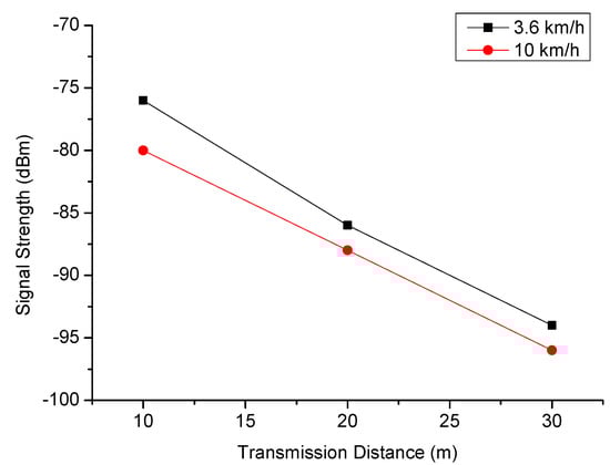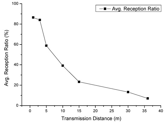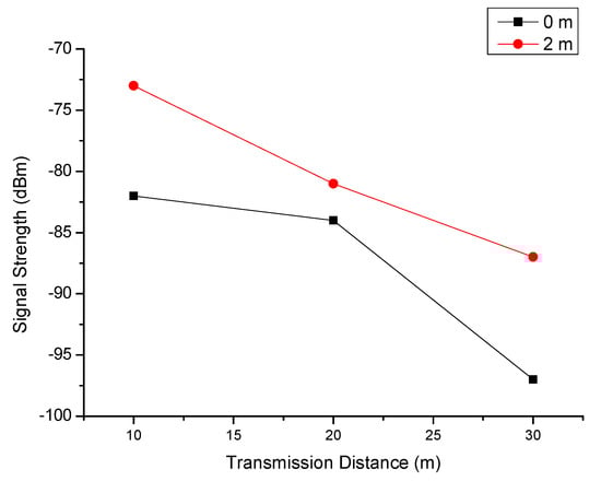 Figure 2 shows the effect of the signal strength on the transmission distance under the user’s different moving speeds at 3.6 km/h and 10 km/h, respectively. The distance between the mobile device and the sensor was measured at 10 m, 20 m, and 30 m, respectively. With the increase of the distance between the mobile device and sensor, the signal strength decreased. In our model, we did not consider the distance between mobile devices and sensors. That is, the communication was not disrupted by the distance (e.g., the distance between mobile devices and sensors was less than 30 m). In addition, the signal strength decreased as the moving speed increased. In this result, we assumed that the user’s moving speed in the urban monitoring system affects the communication between mobile devices and sensors. If the moving speed of the mobile device is faster than a certain level, the probability of data loss ratio between mobile devices and sensors is much higher. Figure 3 shows the signal strength according to the height of the sensor at 0 m and 2 m, respectively, and the distance between the sensor and mobile device was measured at 10 m, 20 m, and 30 m, respectively. This figure shows that the higher the height of the sensor, the stronger the signal is. It can be observed that the sensor should be deployed on the wall rather than on the ground. Therefore, we deployed the sensor on the wall for the experiments. Figure 4 shows the average reception ratio for a transmission distance between 0 m and 40 m. In this graph, with the increase of the distance between the sensor and mobile device, the average reception ratio decreases. Figure 5 shows the average times of the scan interval according to the angle of the beacon.