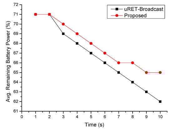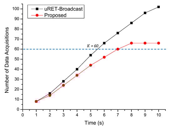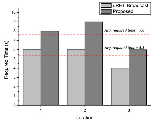 For the performance evaluation of the proposed system, we compared the optimization with uRET-Broadcast [5]. The scenario is as follows: The number of mobile devices that can receive requests was set to 10. Three were deployed and installed every 25 m. The data acquisition threshold K and target battery power of each mobile device were 60 and 50%, respectively. In Figure 6, we show the quantity of data acquisition for the time period. There are two data acquisition graphs: one is the proposed game theoretic optimization approach, and the other is uRET-Broadcast. The game theory-based approach shows the convergence to the data acquisition threshold after getting the Nash equilibrium in 7 s. However, uRET-Broadcast shows that the data acquisition increases as the time period increases, because there is no optimization constraint on this model. However, the convergence time of uRET-Broadcast is faster than the proposed model. This is because all mobile devices on uRET-Broadcast send the data to the cloud server while they stay in the event area of the sensors. Figure 7 shows the average remaining battery power in each time period. There are ten mobile devices with an average battery capacity of 71%. It can be seen that the average remaining battery power of the proposed model decreases by 7 s to acquire the target data quantity, the same as in Figure 7. After converging to the target data threshold, the battery power consumption of the proposed model decreases slowly. On the contrary, the average remaining battery power of the uRET-Broadcast model keeps decreasing. Figure 8 shows the required time for data acquisition in each iteration. It shows that the proposed model requires more time than the uRET-Broadcast model for every iteration. This is because the remaining battery power of mobile devices below 50% is not included in the data acquisition procedure. Although the proposed model requires more time duration, it acquires the data within a few seconds, as well as minimizes the battery power consumption of the mobile devices.