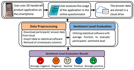 In this study, inspired by the idea of sentiment level evaluation, we used data that came from participants’ questionnaire answers. The concept diagram of this work is shown in Figure 1. In the first step, a participant, using our 3D handicraft product application on their smartphone, completed an online questionnaire, with the answers collected in cloud storage.