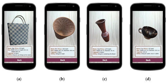 3D handicraft products and details in the smartphone application: (a) bag created from sedge, (b) bin crafted from mangrove palm leaves, (c) vase produced from timber, and (d) cup made from coconut shell.