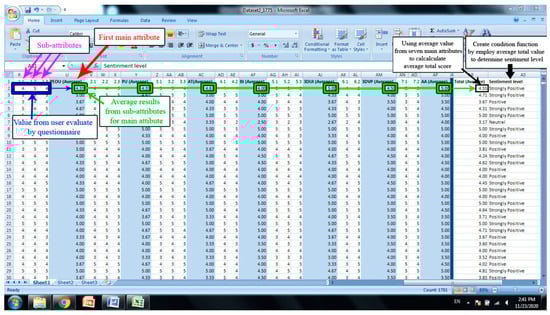 The questionnaire data were divided into two parts: the part used for users’ sentiment level evaluation is the second part of the questionnaire refers to application usage. The first part is the participants’ demography—we used only the participants’ preliminary information, which does not contain any identifiable information. Thus, we decided not to apply the first part, which is unnecessary for sentiment level evaluation. After obtaining data from the questionnaire, we applied statistical software to prepare our data and evaluate participants’ sentiment level by calculating the average in every seven main attributes (PEOU, PU, AT, BI, 3DUI, 3DVP and AA) from its sub-attributes. After that, we computed the average value of all seven main attributes, abd then created the new attribute for the average total, which employs the average value from all seven main attributes to the total average outcome by using an average function provided by statistical software (see Figure 5 for a more in-depth explanation). Once the average total value was obtained, we used this attribute to determine sentiment level by condition (see Table 5).