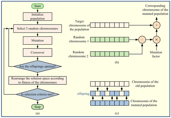 (a) Flowchart of differential evolution (DE), (b) mutation, and (c) crossover.