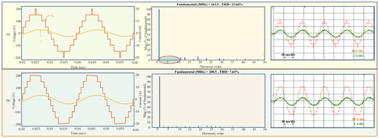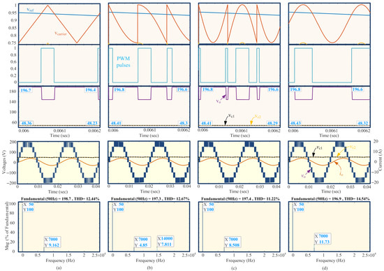 Simulations of DB9LI is performed to analyze the effect of different type of carrier waves on total harmonic distortion (THD) in load voltage and currents. The comparative analysis is done to check the suitability of a particular type of carrier according to the required application. In Figure 6a–d, pulse generation employing all four types of carrier waves discussed in previous subsection is shown. In addition, load voltage and current are also exhibited for each condition in the figure with voltage THD profiles. Simulation has been carried out in the MATLAB/Simulink environment. Parameters taken for the simulation purpose are given in Table 1. The input DC source voltage is taken as 100 V for all modulation techniques. Constant AC Load of resistance 20 and inductor of 20 mH is applied and two capacitors and of 4700 F have been used. The AC load voltage has nine-level boosted output and its harmonic content reside on the multiples of 7000 Hz, that is switching frequency as shown in Figure 6. From Figure 6, it is also seen that the load voltage THD percentage is maximum in case of sine-sine PWM that is, 14.54% and minimum in the case of half-sine PWM that is, 11.22%. Furthermore, the output fundamental voltage is nearly around to 197.5 V which has a frequency of 50 Hz. Lastly, the load current is sinusoidal and the capacitor voltage is maintained at 50 V and contains 4% ripple.