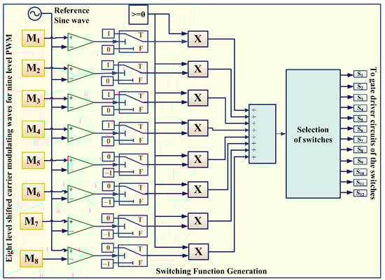 After comparing with the reference signal, the generated output is a pulse signal of unit magnitude. In the next stage, these signals are separated to distinguish the positive half cycle and a negative half cycle of output voltage nine-level wave. For this, the logic is applied by using a two-way switch, which gives output according to the threshold value. The four signals that pertain to positive half cycle are checked whether the signal is greater than 0 or not, and depending upon the previously obtained signal, the output of this stage for the positive half cycle is a pulse of magnitude 0 to 1 and for negative half-cycle pulses of magnitude 0 to −1.