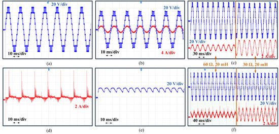 Experimental results of sine–triangle PWM applied to DB9LI: (a) No load voltage, (b) output voltage and load current at 60 , 20 mH, (c) step load change at , (d) capacitor current, (e) capacitor voltage, and (f) step load change at .