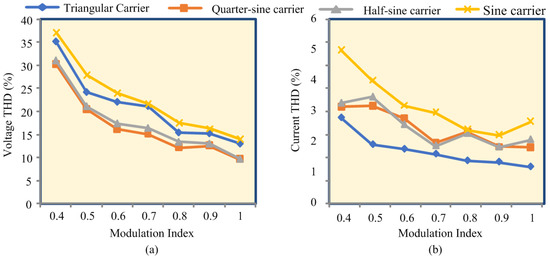 Figure 8a presents the variation in output THD percentage of Voltage with the variation in modulation index when triangular, half-sine and quarter-sine and sine waves are being used as carrier waves by varying the modulation index from 0.4 to 1.0 at the same frequency as mentioned in the control strategy of DB9LI. The inverter circuit is connected to R-L load having values of 30 and 20 mH for the three cases. Figure 8a also gives a clear insight into the benefit of using quarter-sine wave from the voltage THD perspective over the half-sine, triangular carrier or sine carrier, and shows that the THD percentage is low in it. From Figure 8a, it can also be observed that the variation of THD with modulation index is more in case of the sine carrier as compared to the triangle, quarter and half-sine wave PWM. Figure 8b shows the variation of percentage THD in current with the variation in modulation index corresponding to half-sine wave, quarter-sine, sine and triangular carriers, when the amplitude modulation index is being varied from 0.4 to 1. From these two figures (Figure 8a,b), it can be observed that with increase in the modulation index, both the percentage voltage and current THD are following a drooping pattern.