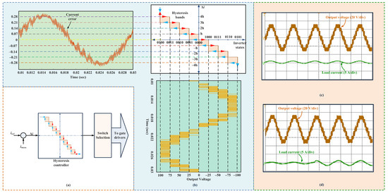 (a) Schematic of eight-band hysteresis control, (b) concept describing the generation of output voltage levels corresponding to the current error; and experimental results (c) at constant load and (d) with change in load.
