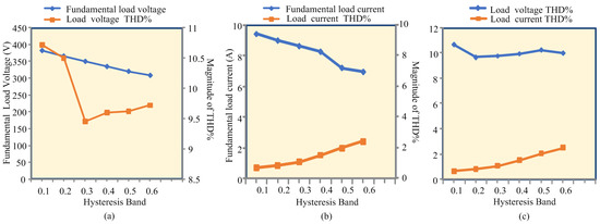 Variation in (a) fundamental voltage and its THD, (b) fundamental current and its THD, and (c) voltage and current THD.