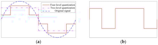 (a) Four-level and two-level quantization within one cycle of the carrier, respectively; (b) The binary sequence of DSSS signal.