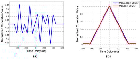 There are two orthogonal bases, they are signal and extra signal . The correlation result of the two bases will introduce interference as shown in Figure 2. The interference is actually introduced by the sub-carrier with the same PRN code, which is called sub-carrier (S-C) interference. Figure 2b shows the influence of S-C interference on the correlation curve, and it can be seen that it causes the distortion of the correlation curve.