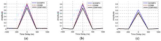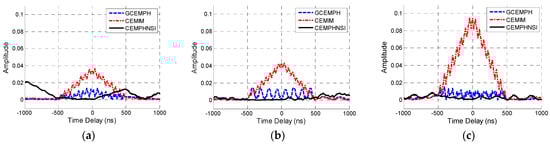 Figure 7a shows the normalized cross-correlation results of and three multiplexing signals. The three multiplexing signals are implemented using CEMIM, GCEMPH and CEMPHNSI methods, respectively. Figure 7b shows the normalized cross-correlation results of and three multiplexing signals; Figure 7c shows the normalized cross-correlation results of and three multiplexing signals. Figure 8a shows the normalized cross-correlation results of and three extra signals. The three extra signals are extra parts of CEMIM, GCEMPH and CEMPHNSI, respectively. Figure 8b shows the normalized cross-correlation results of and three extra signals; Figure 7c shows the normalized cross-correlation results of and three extra signals. In Figure 7, the maximum correlation result of CEMPHNSI is lower than GCEMPH that because the multiplexing efficiency of CEMPHNSI is lower than GCEMPH. In Figure 7c, the maximum correlation result of CEMIM has a noticeable drop, the reason is CEMIM has power leakage shown in Figure 8c and it is negatively correlated with the correlation result. From Figure 8, it can be seen that the CEMIM has more power leakage in extra signal compared with GCEMPH proposed in this paper, and GCEMPH and CEMIM all introduced sub-carrier interference compared with CEMPHNSI.