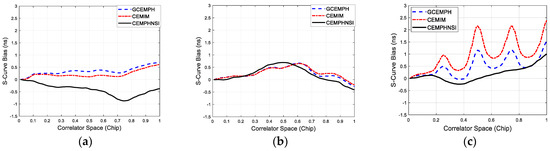 Figure 9 and Figure 10 provides the S-Curve bias and slope of 3 multiplexing signals introduced by extra signal, respectively. From Figure 9, it can be seen that the S-Curve bias of the and are no more than 1 ns, while for the , the CEMIM introduces the more S-Curve bias compared with GCEMPH and CEMPHNSI, which more than 2 ns, that because the CEMIM has more power leakage. From Figure 10, it can be seen that the sub-carrier interference will cause the S-Curve slope fluctuations, and because the CEMPHNSI doesn’t have sub-carrier interference, it won’t introduce the S-Curve slope fluctuations.