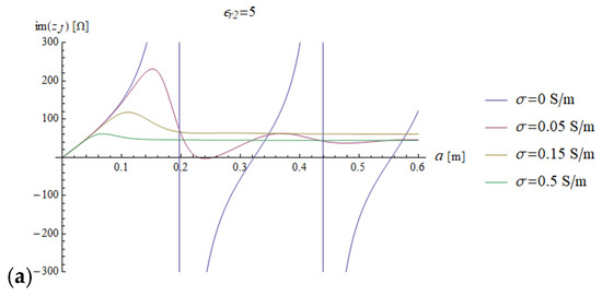 In all the simulations, the carrier frequency was set to 292.7 MHz, which is the operating frequency of 7 T MR scanners, the external medium was air (r1 = 1) and the relevant quantities were plotted for a sphere with radius ranging from 0 to 0.6 m (corresponding to ). We investigated the dependence of the reflection coefficient (Figure 4) and impedance (imaginary and real part in Figure 5 and Figure 6, respectively) on different values of relative electric permittivity (r2 = 5, 25, 50) and conductivity (σ = 0, 0.05, 0.15 and 0.5 S/m).