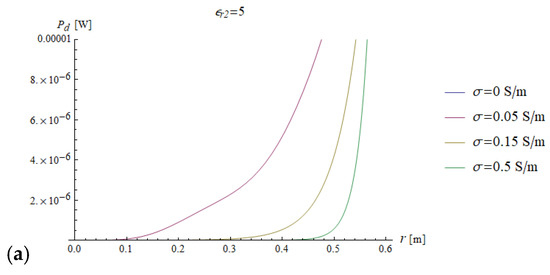 Figure 10 shows the power dissipation, which is the integral of the power density and is a monotonic function of the radial coordinate . As expected, the higher the conductivity, the lower the capacity of the field to penetrate inside the sphere, and the power is mainly dissipated in the peripheral region of the sphere.