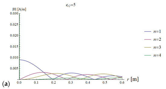 Magnetic field distribution as a function of the radial coordinate in a lossless ( S/m) sphere of radius for the first four modes. Results are shown for different values of relative permittivity (5, 25 and 50 in (a–c), respectively).