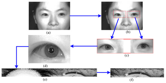 Process of iris preprocessing (a) original image (b) eye location (c) eye segmentation (d) iris location and segmentation (e) iris normalized, size (f) iris lower semicircle, size .