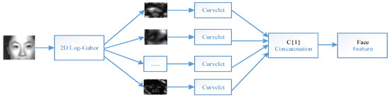 Due to the multi-scale and multi-directional characteristics of 2D log-Gabor, a lot of information will be generated after the image is filtered. Many scientists proposed various methods on how to extract features from the information, such as taking its amplitude, standard deviation, or LBP, or PCA, and so forth. In this paper, we use curvelet to extract features from the information. The steps are shown in Figure 3. In the Figure 3, the C{1} is a coefficient of the first layer of Curvelet. It is used to represent the features.