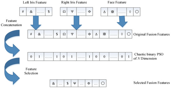According to the method above, the features of dual iris and face are extracted and normalized. We may obtain the original fusion features by simply concatenating the left and right iris features and face features. Those fusion features usually contains more redundant information. Those information will not only increase the computational complexity, but also may have some mutually exclusive information, which will affect the result of fusion recognition. Therefore, we propose a feature selection strategy based on a modified chaotic binary particle swarm optimization (MCBPSO) and a kernel extreme learning machine (KELM).Each dimension of the original fusion features is represented by a binary code (0 or 1) .The feature subspace is constructed randomly. The KELM classification accuracy is taken as a fitness value of the MCBPSO. It is used to optimize the particle, so as to select the optimal feature space and construct the final fusion feature. The details are visualized in Figure 4.