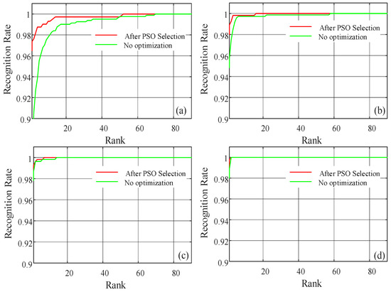 The results reveal that our face iris multimodal biometric recognition system achieves the best performance (in FAR and GAR). Figure 7 shows the comparison of CMC curves between before and after MCBPSO optimization.Due to the pseudo randomness of chaotic system, the feature subspace selected after each experiment is different. As a result, the corresponding recognition rate is also different. We need to do the experiment several times to obtain an optimal result. From those experiments, we have to choose the feature subspace with less features but the best recognition performance.