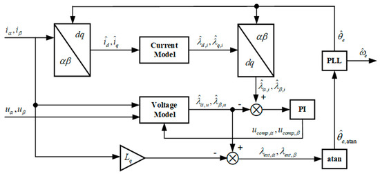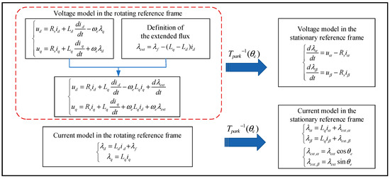 An illustration diagram of the equations above is summarized in Figure 1, including the voltage model and current model used in the extended flux-based sensorless control technology. in the diagram is the Park transformation matrix.