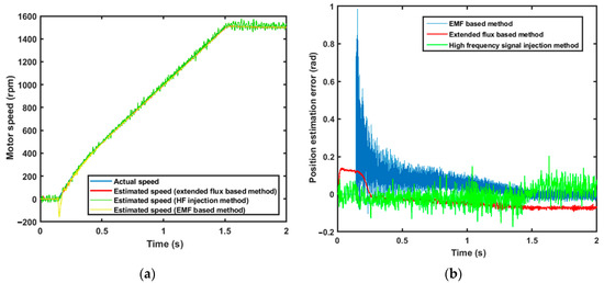Comparison of the three mainstream rotor position estimation methods: (a) Speed estimation results over full speed range; (b) Rotor position estimation error over full speed range.