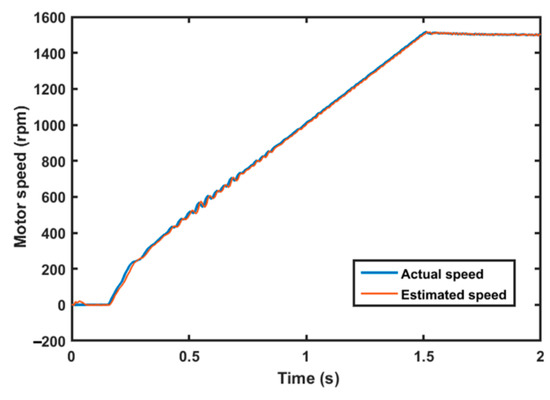 Both the advantages of the current model at low speed and that of the voltage model at high speed are taken in the position estimation method above, making it a full-speed-range sensorless control technology. This feature is of great importance for fault-tolerant control of traction motors, because the operating speed of traction motors changes rapidly, and frequent technology switching between high and low speed will lead to unreliability of the whole system. The comparison between the extended flux-based estimation method and the other two mainstream methods, i.e., the high frequency signal injection method and the EMF-based method is given in Figure 4. The motor is started from standstill and accelerated to 1500 rpm (rated speed of the tested motor) with speed sensor under rated load. The three estimation methods are applied at the same time. The simulation results validate that only the extended flux-based method can realize accurate estimation in full speed range. In Figure 5, the estimation results of the extended flux-based method are used to realize sensorless control of the motor, which show its accuracy and reliability.