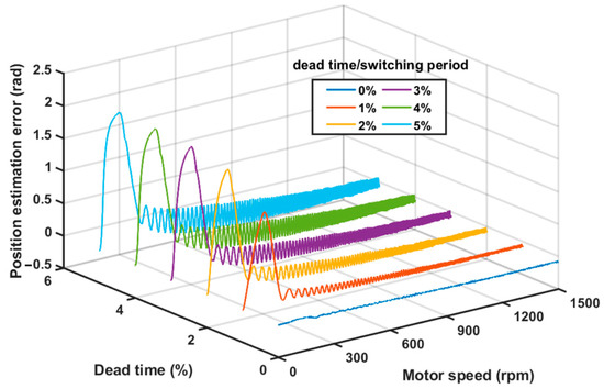 Rotor position estimation error of the extended flux-based observer with different dead time.