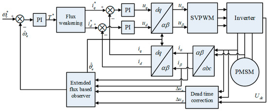 Instead of compensating the output voltage, correcting the stator voltage used in the extended flux observer will be an effective and simple solution for this problem. By limiting the impact of dead-time correction to the rotor position estimator, reliability of the vector control system can be guaranteed. The structure of the extended flux-based sensorless control system with dead-time correction is shown in Figure 7. The stator voltage is used only in the voltage-model-based observer in (8), which is corrected by the dead-time voltage deviation as follows: