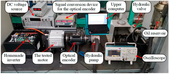 The purpose of this section is to verify the properties of the proposed extended flux-based sensorless control system with dead-time correction. For the experiments, a homemade three-phase two-level IGBT inverter switching at 6 kHz and a DC voltage source of 540 V are applied. The strategy is realized with a digital controller based on DSP TMS320F28035 with a clock speed of 60 MHz [30]. The motor is loaded by a hydraulic circuit, which consists of a hydraulic oil pump, a hydraulic valve, an oil reservoir and high-pressure oil pipes. Furthermore, an optical encoder is installed between the tested PMSM and the pump to validate the motor speed and position estimation. The experimental setup is shown in Figure 8. The parameters of the tested PMSM are given in Table 1.