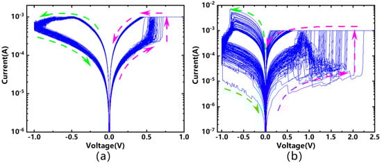 - Sun, B.; Liu, Y.X.; Liu, L.F.; Xu, N.; Wang, Y.; Liu, X.Y.; Han, R.Q.; Kang, J.F. Highly uniform resistive switching characteristics of TiN/ZrO2/Pt memory devices. J. Appl. Phys. 2009, 105, 061630. [Google Scholar] [CrossRef]