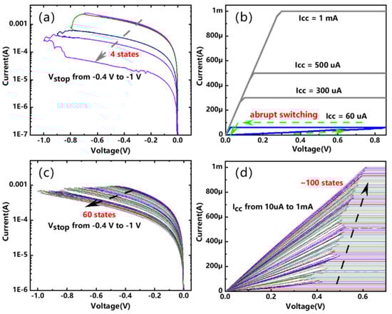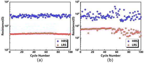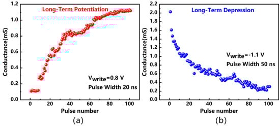- Chuang, K.C.; Chu, C.Y.; Zhang, H.X.; Luo, J.D.; Li, W.S.; Li, Y.S.; Cheng, H.C. Impact of the stacking order of HfOx and AlOx dielectric films on RRAM switching mechanisms to behave digital resistive switching and synaptic characteristics. IEEE J. Electron Devices Soc. 2019, 7, 589–595. [Google Scholar] [CrossRef]