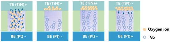 - Fang, Y.; Yu, Z.; Wang, Z.; Zhang, T.; Yang, Y.; Cai, Y.; Huang, R. Improvement of HfOx-Based RRAM Device Variation by Inserting ALD TiN Buffer Layer. IEEE Electron Device Lett. 2018, 39, 819–822. [Google Scholar] [CrossRef]