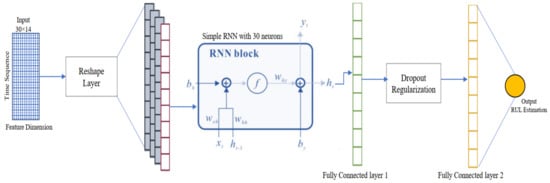 Table 2 demonstrates the RNN method structural design with the simple RNN neurons. This model uses a reshape layer to convert sequence input to time-series input. The following layers of the DNN model interpreted these sequence vectors’ geometric relationships to learn deep feature representations and evaluated them by the output layer in order to render predictions; a single linear unit is used. Figure 1 presents the proposed simple RNN-based model structure for RUL prediction.