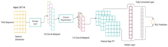 The deep CNN learning ability is enhanced by utilizing multiple non-linear feature extractions. It can learn hierarchical representations from data on its own. As a result, the scale of the convolution kernel and the number of convolution layers significantly affect prediction performance. The proposed CNN architecture for RUL prediction in this research study is presented in Figure 3, and the attention mechanism employed is similar to the one shown in Figure 2 (bottom). Therefore, the input datum is two-dimensional (2D), where the feature number takes up one dimension, and the sensor’s time sequence is the other dimension.