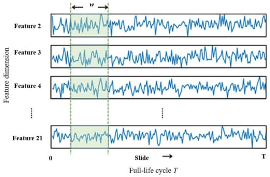 Additionally, a sequence to target the problem can be expressed as RUL estimates. A time series of length T is with , where n is the sensors’ number, and m the samples number per cycle. Hence, the goal is to estimate the corresponding output , where represents all samples at cycle t. When the sliding window technique is employed, the earlier formulation must be revised to , where w is the window size. Thus, the vector contains all the samples in the TW, which is denoted as . In our settings, the size of the sliding step is always set to one. The sequence length specifies how historical data are employed in any model, whereas the window size describes the complexity of dynamic features across time. Both parameters should be examined when optimizing the model because they have such a significant impact on its performance.