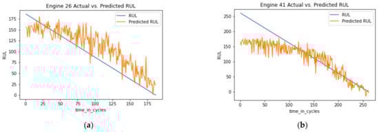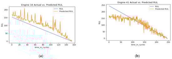 This section aims to evaluate and validate our different DNN candidate models proposed for turbofan engine RUL estimation. For better prognostic characteristics analysis, the actual and predicted RULs of testing units are compared in Figure 7, where testing units are sorted in an ascending order by actual RUL. The predicted RUL values for the suggested LSTM-based attention mechanism architecture are comparable to the actual RUL in two random cases (engine 24 and engine 41; randomly selected), as shown in Figure 7. The second evaluation test is conducted for the GRU-based attention candidate model. The results presented in Figure 8 show that the model was able to predict the RUL for two random cases (engine 26 and engine 41). However, the RUL case of engine 41 was randomly predicted by using LSTM-based attention mechanism and GRU-based models. Hence, the LSTM-based attention mechanism model show better prediction of RUL engine 41, as shown in Figure 7, Figure 8, Figure 9 and Figure 10b, respectively.