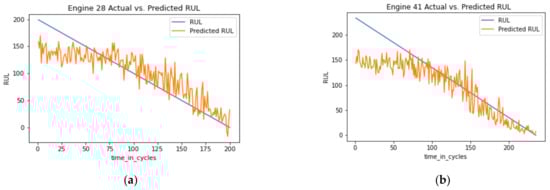 RUL prediction results of FD002 using the proposed CNN architecture of the fourth verification test: (a) RUL prediction for the first randomly selected case (engine #28); (b) RUL prediction for the second randomly selected case (engine #41).