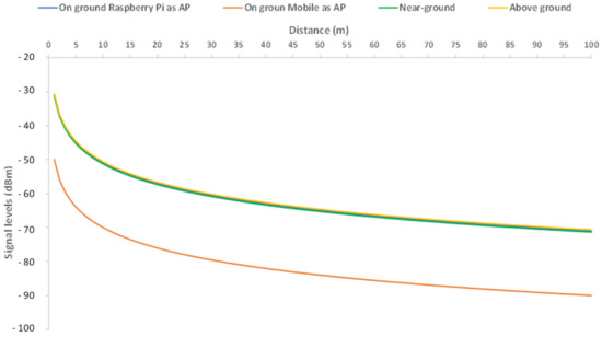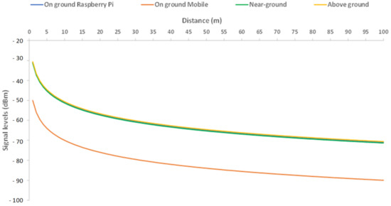 As the figure shows, the performance of the Raspberry Pi and the near-ground and above ground transmitters was almost the same, and signal levels barely surpassed −71 dBm. However, in the case of the mobile phone, signal levels reached −80 dBm after 32 m.