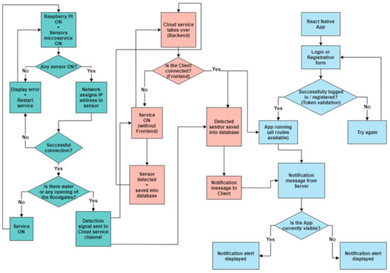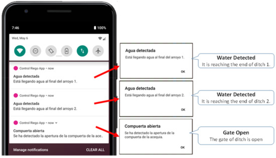 The complete system is made up of a deployment of wireless nodes with sensors in charge of monitoring different parameters in the field. Concretely, the system is composed of a Raspberry Pi3B+ [8] that acts as a gateway and uses Raspbian as the operating system (O.S.). The sensor nodes were developed using Wemos D1 Mini modules [9] whose firmware is based on the basic firmware provided by Arduino. However, it was customized to enable only those elements that we only really needed. These wireless nodes were connected to a gateway based on WiFi technology. Both sensor nodes and the gateway require a protocol to exchange the collected information. In this case, we used the version of Firmata protocol published on 23 July 2021. This gateway is in charge of creating the local network that will allow farmers to visualize the events detected by the sensors and the end of each stream. To do that, the farmers use a smart phone that runs Android 9.0 Pie as an O.S.