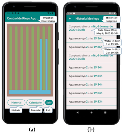 Table 6 presents a comparison of previous related studies. As it shows, most systems rely on user input data associated with soil and crop data as well as irrigation systems and meteorological data. Moreover, most applications do not use sensors to trigger events, although many studies recommend doing so. The difficulty level of these mobile applications is often medium/high since farmers are required to have technical knowledge of soil properties as well as technologies in order to correctly introduce the solicited data. In our proposal, we present a mobile application for food irrigation control and irrigation scheduling that allows farmers to remotely control water gates and relies on sensed data from the plantation field. The main novelty of the system lies in the simplicity and cost deployment. The system is built with very cheap hardware that must perform extremely simple monitoring tasks. This gives the system the required robustness for the overall objective of our proposal. The gateway can be deployed using a Raspberry Pi or using a smartphone.