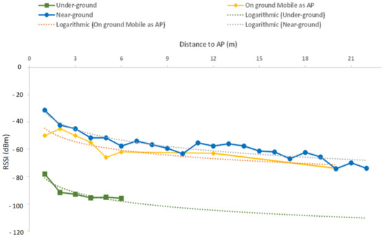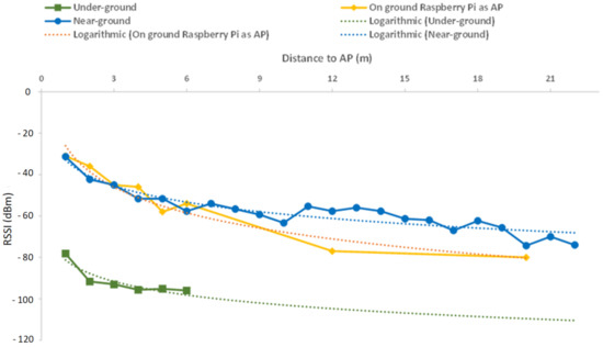 A similar approach can be seen in Figure 20, where a comparison was made between the coverage area of these two sensors, but using a mobile phone as an AP. In this case, the measured RSSI obtained from the mobile phone was lower than the one obtained from the transmitter placed 30 cm above ground. However, its coverage range was very similar to the one obtained with the Raspberry Pi, which indicates that placing both the transmitter and the receiver on the ground can be a good approach.