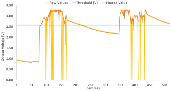 Figure 21 shows the amplitude of the voltage signal emitted by the water sensor. As stated before, the analog signal emitted by the water sensor has a 1024 bits resolution. Whenever the sensor is partially or completely underwater, the signal reaches its maximum level. This graph allows us to establish the threshold level to control the sensors and determine the range of values that will trigger the water detection notifications. Based on the tests carried out, the threshold value was set to 800. Therefore, all values above this threshold will trigger water detection notifications. In this graph, the yellow signal represents a test in which the sensor was underwater a second time. In this case, the signal slowly decreases as the sensor continues to be wet, even though it was not completely covered by water. Thus, a threshold higher than 800 would continuously trigger water detection notifications, despite the fact that the sensor was not underwater.