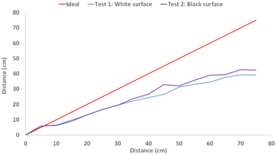 Figure 22 shows the distance measured with the proximity sensor, in centimeters, in relation to the ideal values given by their linear relationship. However, as Figure 22 shows, the collected measurements have a significantly lower value. As mentioned in the device description, the theoretical coverage range of this sensor varies from 10 cm to 80 cm, approximately.