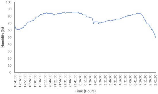 The data of the environmental parameters was obtained from the weather monitoring node in [27]. The node is comprised of a DHT11 digital temperature and humidity sensor, a light sensor, and a rain sensor. The presented data were measured to determine the changes in humidity, temperature, and luminosity on a March night in a Mediterranean region in Spain. The rain sensor only determines whether it is raining or not. It did not rain during the measurements. The values were taken using a 5-min interval. Figure 23 presents the humidity values for a night at the Mediterranean. As can be seen, humidity increases when the sun has set and decreases in the morning.